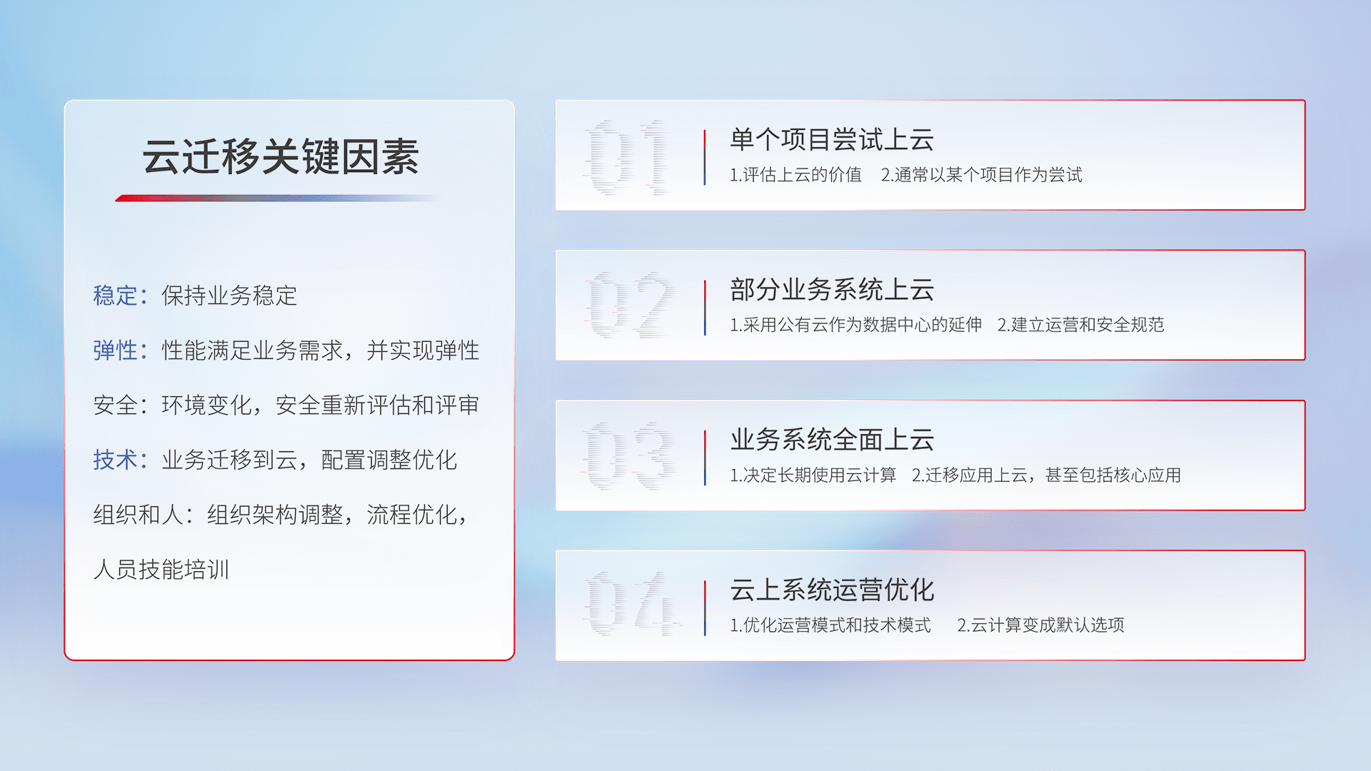 结合实际业务,,,从规划设计、、、、云平台选型、、、云原生改造、、数据迁移、、、集成交付,,迁移全过程为客户识别最佳上云路径,,,做好风险识别管理,,,设计网络架构、、身份权限、、安全审计合规、、操作审计、、、、日志审计、、、、监控告警策略、、、多站点容灾设计等,,对云上基础设施进行整体规划,,提升IT治理水平,,,,以满足弹性、、高可用、、、、高性能的需求。。。。